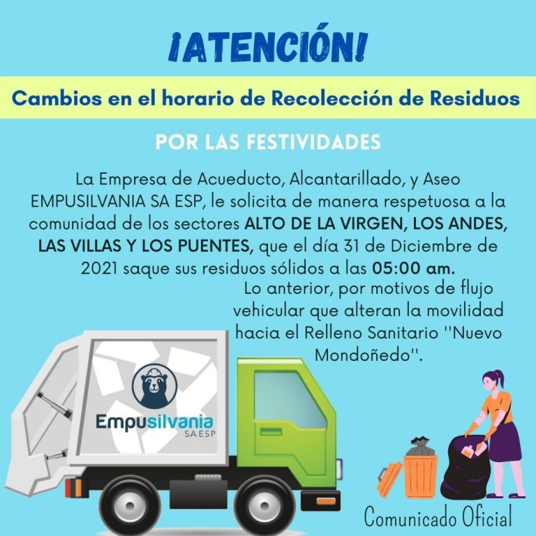 EMPUSILVANIA S.A E.S.P. Informa a todos los usuarios del servicio de ASEO RECOLECCIÓN que las rutas del vehículo compactador de basura, se modifican para los días 8 y 9 de abril del año en curso con motivo a la Semana…