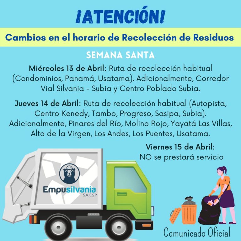 La Empresa de Acueducto, Alcantarillado, y Aseo EMPUSILVANIA S.A. E.S.P., informa a la comunidad en general los cambios en las Rutas de Recolección de Residuos Sólidos los días 13, 14 y 15 de abril debido a la Semana Mayor "Semana…
