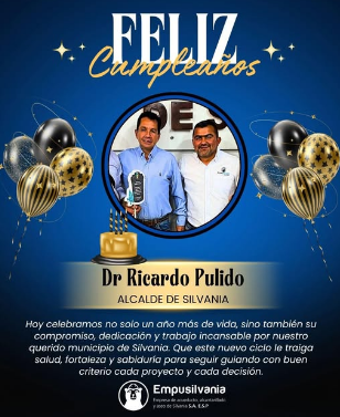 Hoy enviamos un saludo muy especial de cumpleaños a nuestro Alcalde Ricardo Pulido, gracias por su liderazgo, por escuchar a la comunidad y por impulsar acciones que hacen de Silvania un lugar cada vez mejor.